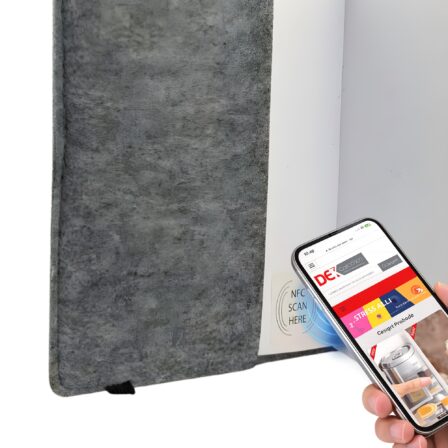 A5 fashion felt cover notebook with black elastic band closure it has 80 leaves(160 pages) of white 70gsm recycled lined paper it is a great promotional notebook with unique soft felt material cover. NFC is available as an optional add-on for this product.