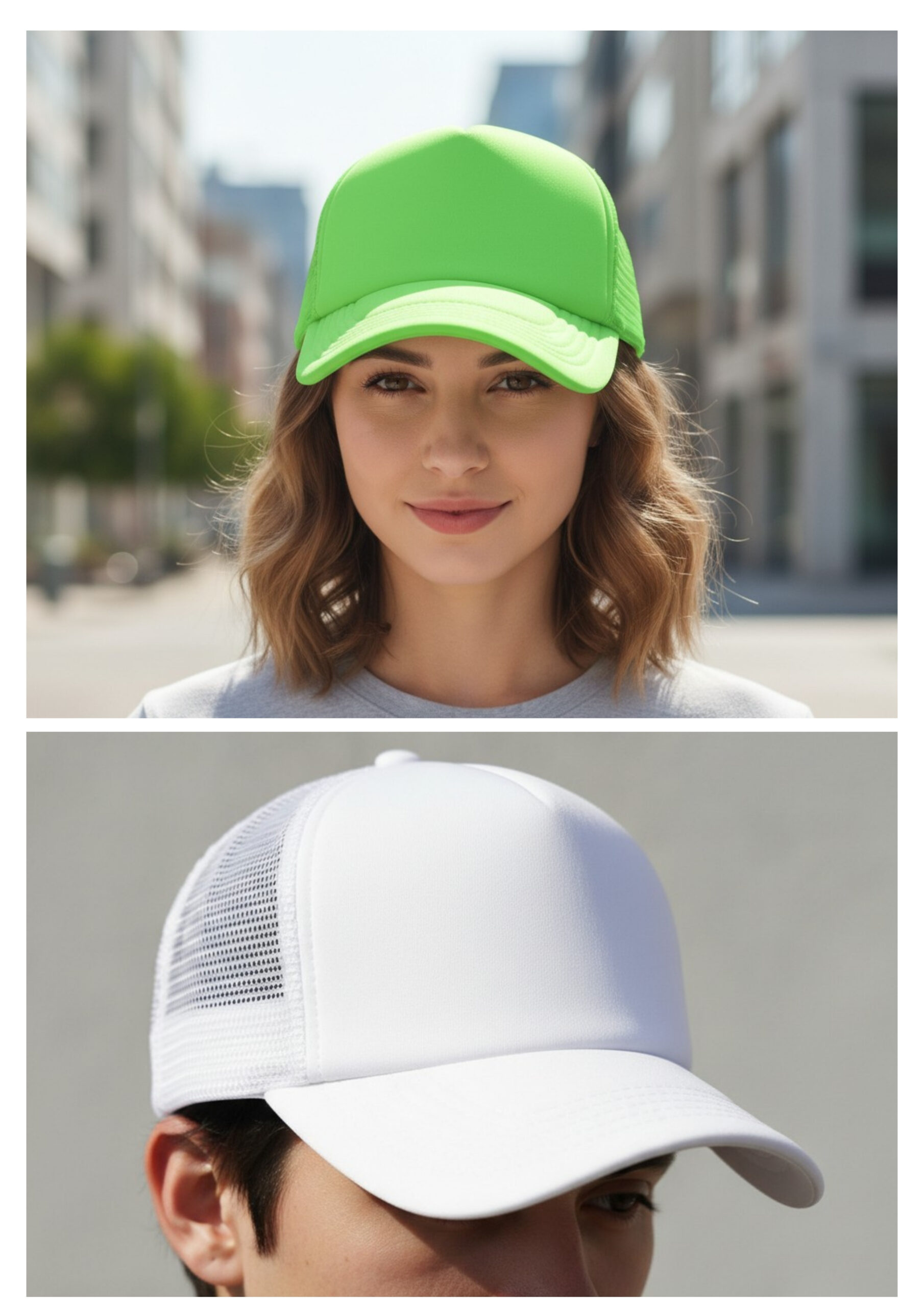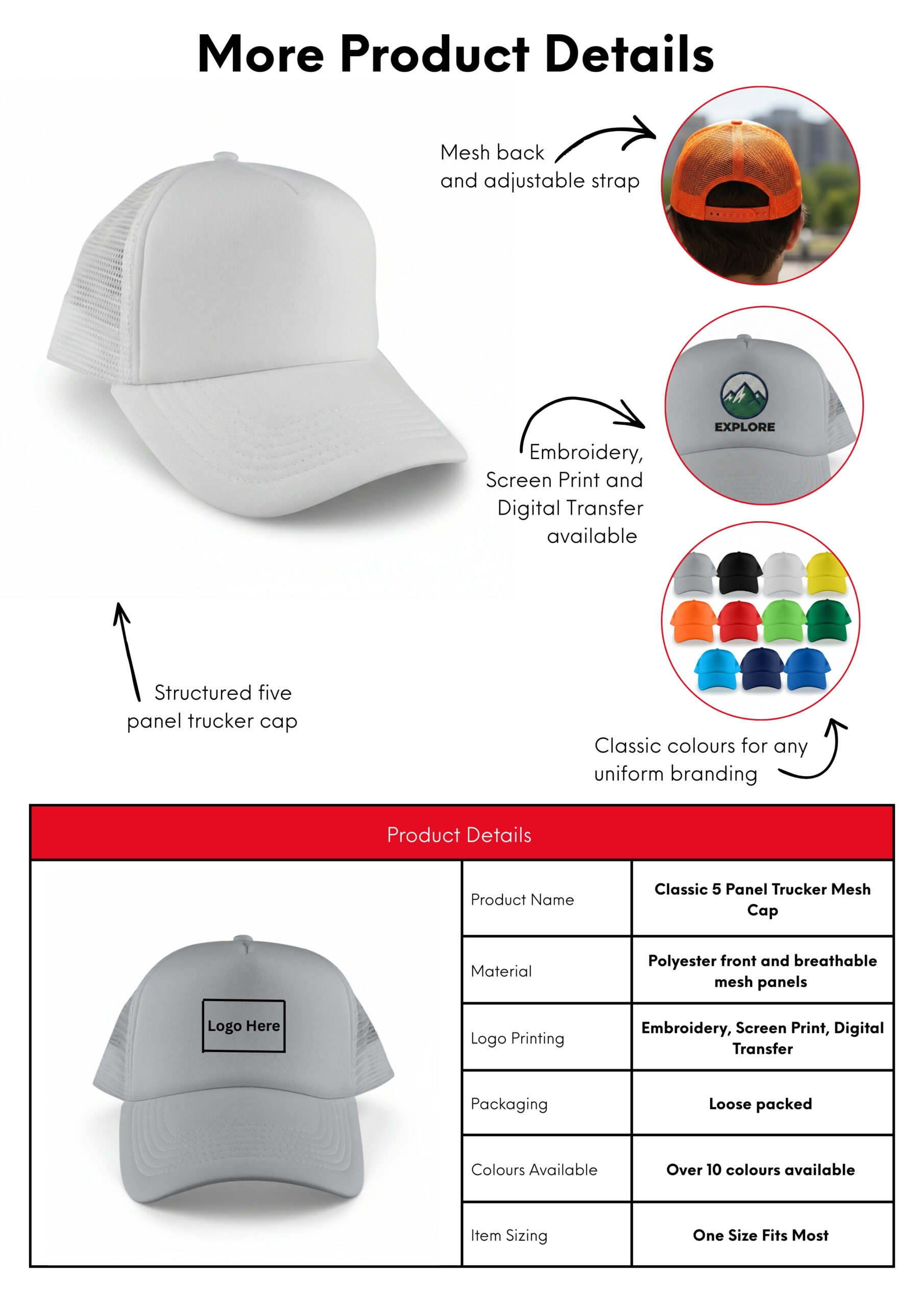 Stylish structured five panel trucker cap with a padded polyester front and breathable mesh panels on the side and back. It has a pre-curved peak, a sweatband and an adjustable snap back closure which allows one size to fit most people.