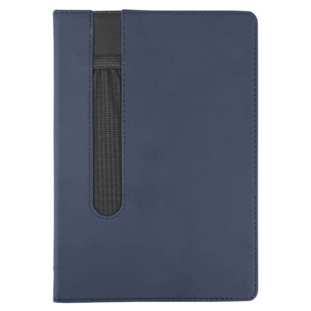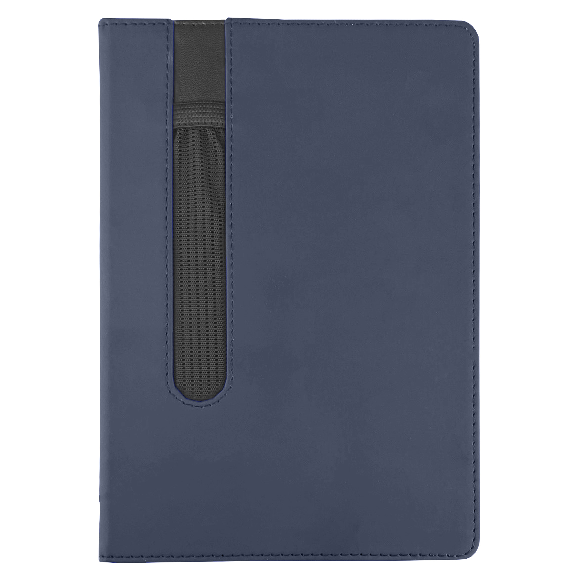 A5 soft-touch PU leather notebook with built-in black pen sleeve on the front cover. 80 lined off-white pages with black elastic closure and matching colour fabric bookmark.