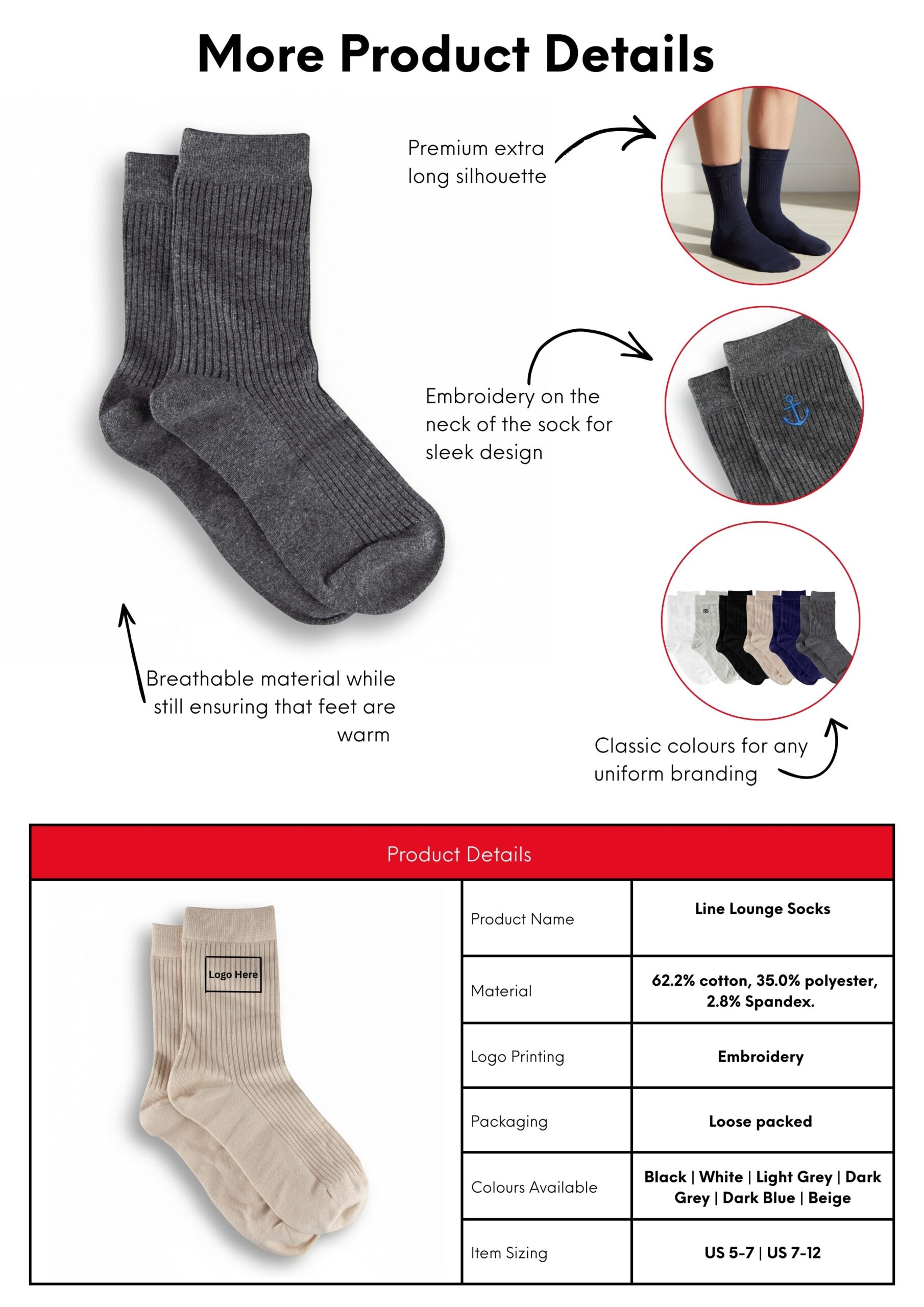 The Line Lounge Socks feature a premium extra-long silhouette designed for maximum coverage and ultimate relaxation. This carefully crafted blend of 62.2% cotton and 35.0% polyester ensures a breathable, durable feel that keeps your feet cozy without overheating. Finished with 2.8% Spandex, they provide a flexible, stay-put fit that moves with you throughout your day.