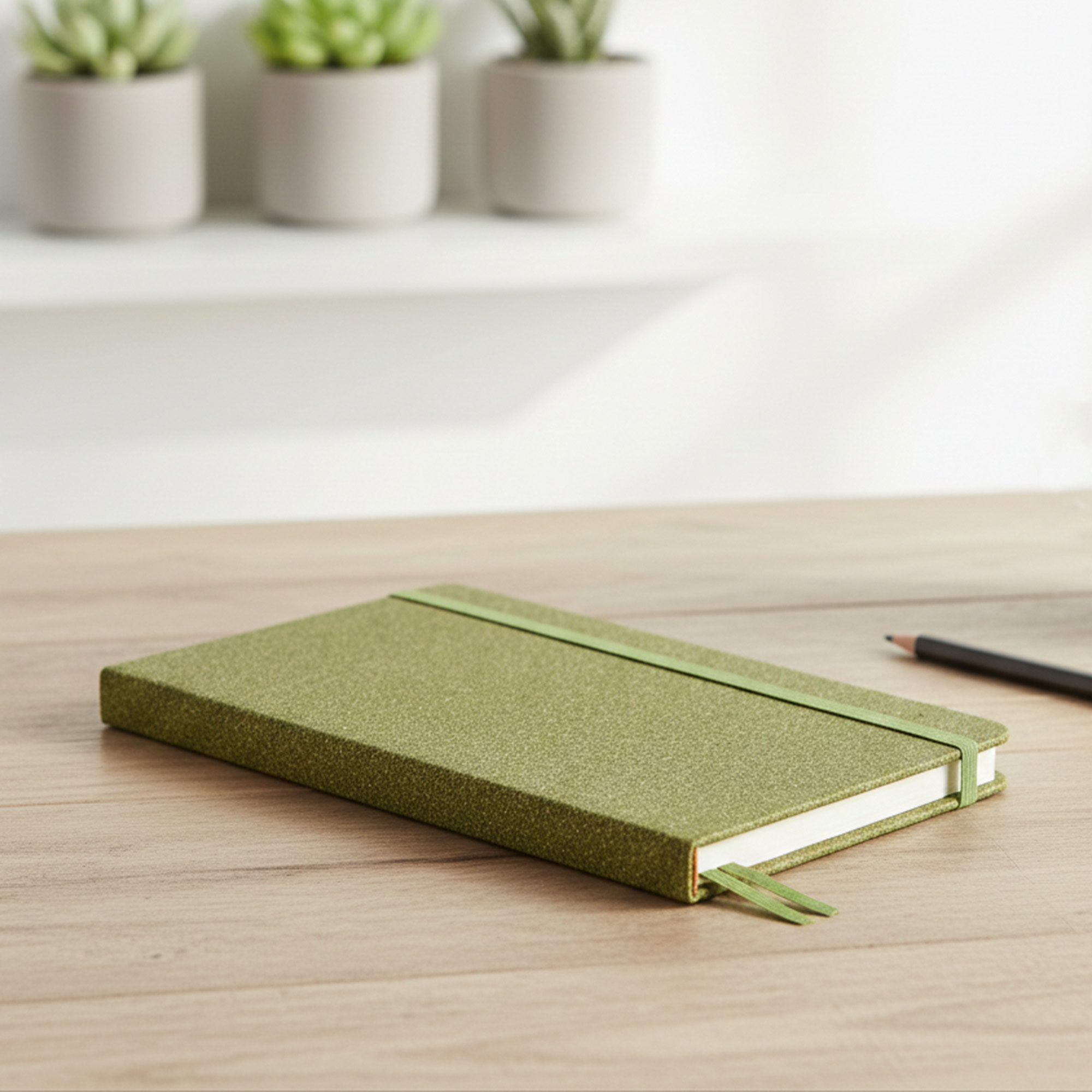 Discover a notebook as unique as your ideas, featuring a cover made from naturally pressed tea leaves. Each cover showcases the delicate textures and subtle hues of real leaves, creating a tactile and eco-friendly writing companion. When first opened, the notebook carries a gentle, natural tea leaf aroma that adds to its sensory charm, though the scent will gradually fade over time. Perfect for journaling, sketching, or note-taking, this notebook combines sustainability with elegance, making every page feel special. Please note: tea leaf grain and tone may vary slightly from piece to piece.